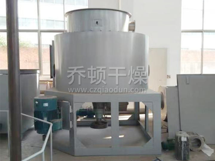 热空气切线进入干燥器底部,在搅拌器带动下形成强有力的旋转风场。膏状物料由螺旋加料器进入干燥器内,在高速旋转搅拌桨的强烈作用下,物料受撞击、磨擦及剪切力的作用下得到分散,块状物料迅速粉碎,与热空气充分接触、受热、干燥。脱水后的干物料随热气流上升,分级环将大颗粒截留,小颗粒从环中心排出干燥器外,由旋风分离器和除尘器回收,未干透或大块物料受离心力作用甩向器壁,重新落到底部被粉碎干燥。