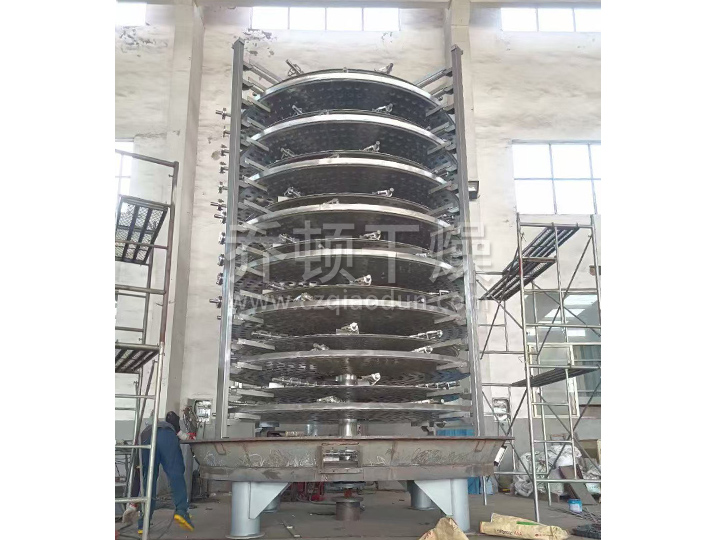湿物料自加料器连续地加到干燥器上部第一层干燥盘上,带有耙叶的耙臂作回转运动使耙臂作回转运动使耙叶连续地翻抄物料。物料沿指数螺旋线流过干燥盘表面,在小干燥盘上的物料被移送到外缘,并在外缘落到下方的大干燥盘外缘,在大干盘上物料向里移动并从中间落料口落如下一层小干燥盘中。大小干燥盘上下交替排列,物料得以连续地流过整个干燥器。中空的干燥盘内通入加热介质,加热介质形式有饱和蒸汽、热水和导热油,加热介质由干燥盘的一端进入,从另一端导出。已干物料从底层干燥盘落到壳体的底层,而后被耙叶移送到出料口排出。湿份从物料中逸出,由设在顶盖上的排湿口排出,真空型盘式干燥器的湿气由设在顶盖上的真空泵口排出。从底层排出的干物料可直接包装。通过配加翅片加热器、溶剂回收冷凝器、袋式除尘器、干料返混机构、引风机等辅机,可提高其干燥的生产能力,干燥膏糊状和热敏性物 料,可方便地回收溶剂,并能进行热解和反应操作。
